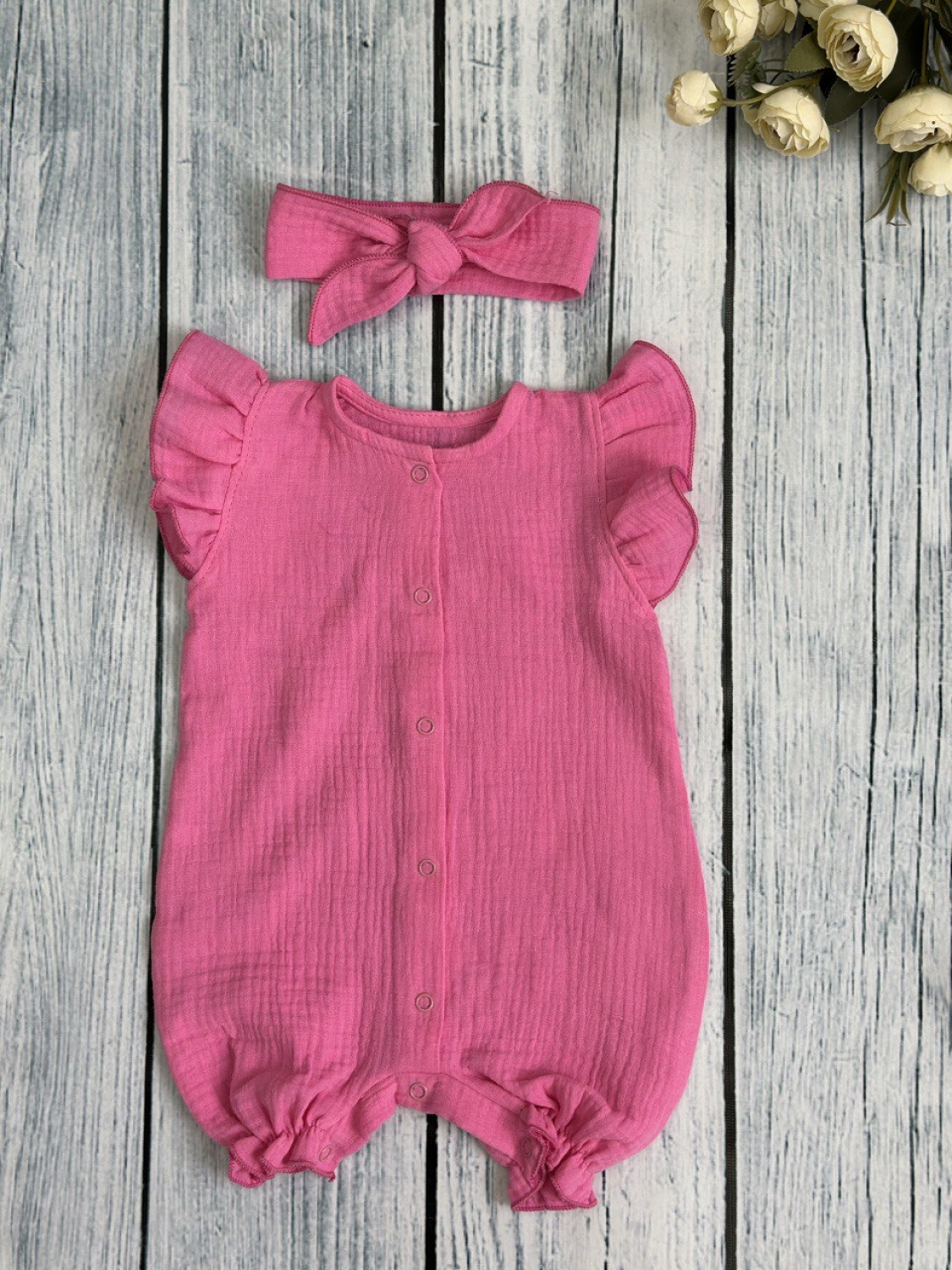Купить оптом 341-Ф. Песочник с повязкой для девочки из муслина, хлопок 100%, р 62,68,74,80 фуксия в Химках